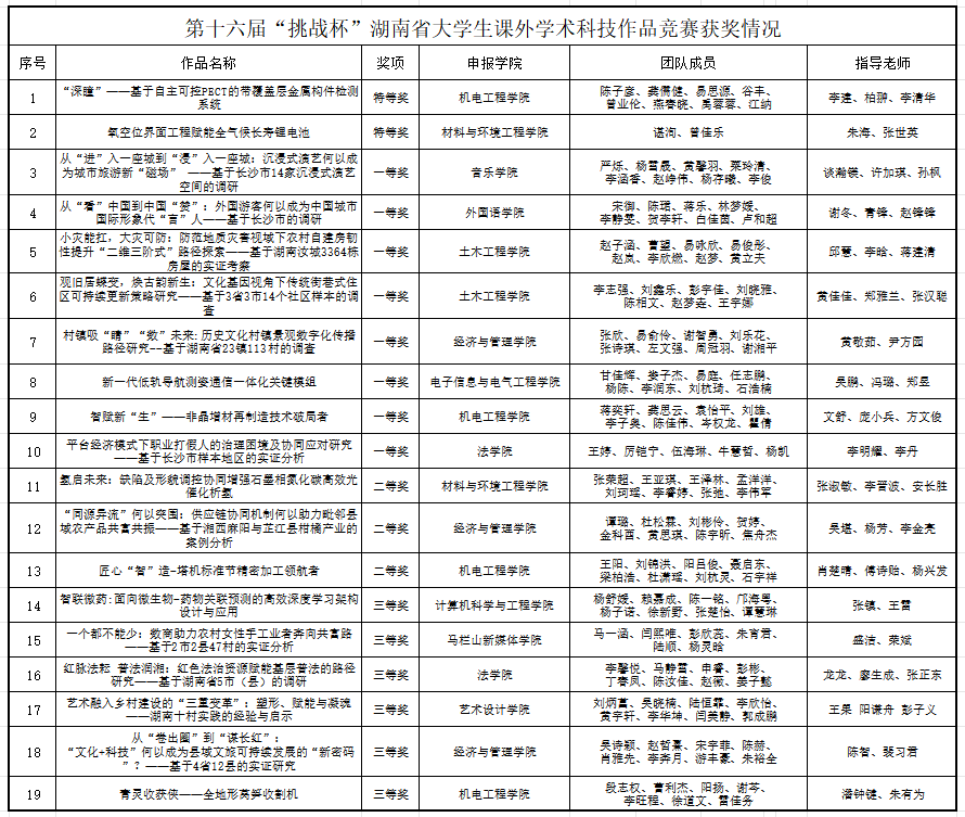 6月10日至13日,由共青团湖南省委、湖南省教育厅、湖南省科学技术协会主办的第十六届“挑战杯”湖南省大学生课外学术科技作品竞赛在邵阳学院举行。全省98所高校的417个项目同台竞技,最终我校参赛团队获特等奖2项、一等奖8项、二等奖3项、三等奖6项,团体分排名位列全省第四,实现了学校在该项赛事中的新突破。同时,学校蝉联“优胜杯”荣誉称号,彰显了长大学子在学术科技领域的创新实力与团队协作精神。