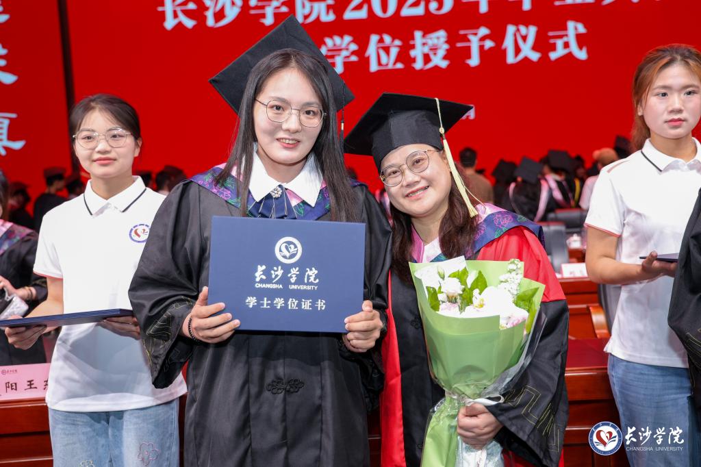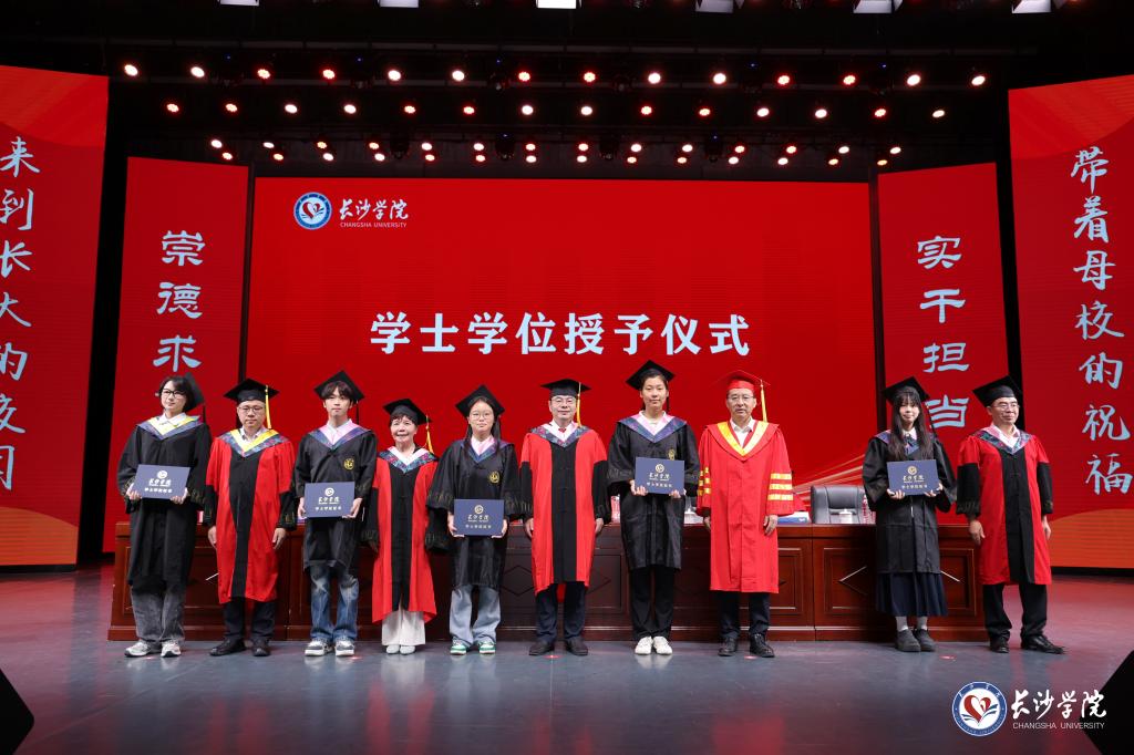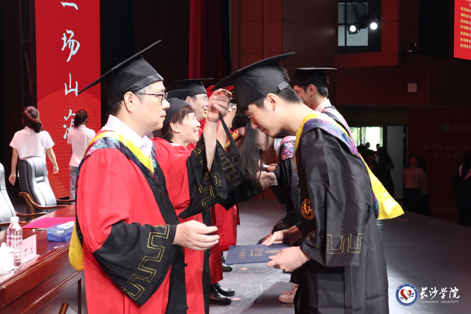 党委委员、副校长阳王东宣读了《长沙学院学位评定委员会关于授予2025年学士学位的决定》。党委委员、纪委书记丁文宣读了省级、校级优秀毕业生表彰文件。校领导依次为学校“湖南省2025届优秀毕业生”代表颁发荣誉证书。