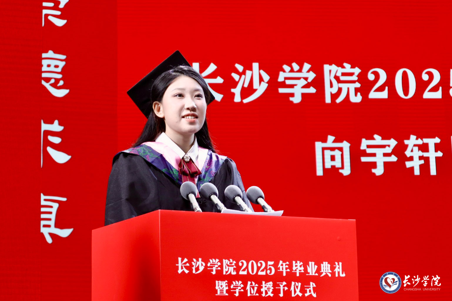 国家奖学金获得者、湖南省优秀毕业生、马栏山新媒体学院向宇轩同学,法学院院长童伟华教授,长沙广电数智融媒科技有限公司总经理崔希芳分别作为优秀本科生毕业生代表、教师代表、校友代表依次发言。