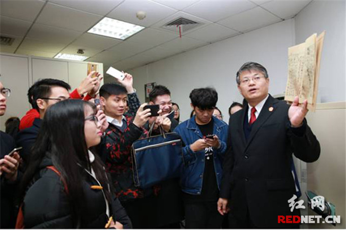 为了欢迎前来体验的大学生们,湖南省高级人民法院党组书记、院长康为民特意前来与大家交流并合影。随后省高院新闻发言人李宇先引领学生们依次前往参观了法院立案信访大厅、法官接访室、律师接访室、审判大楼、法院文化浮雕、数字法庭、大审判法庭、数字法庭、新闻发布厅、档案室、信息集中控制中心参观。以往大家心目中的“铁面”法官此刻成了细致耐心的“解说员”。他一边走,一边向大家介绍法院的主要职能、审判流程、法院新闻发布情况等。在数字法庭,李宇先还热情地邀请同学们坐上审判席,近距离了解法院。在新媒体工作室,大家饶有兴致地观看了介绍湖南法院工作的视频短片,以及法院自创的优秀微电影。