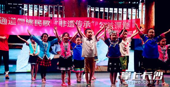 通过公益课堂的学习与训练,孩子们都能较好地完成3-4首侗族民歌的演唱。在平坦乡皇都村,还组成了童声“侗”听小合唱团,并将其推向皇都民族演艺舞台,《筑塘歌》《敬酒歌》,精彩的表演,赢得了现场千余名观众经久不息的掌声与喝彩,当地一位村干部更是激动地拉着团队师生的手:“非常感谢你们能给孩子们这么好的表演机会,这也让我们正真看到了侗族传统民歌传承下去的希望。”。