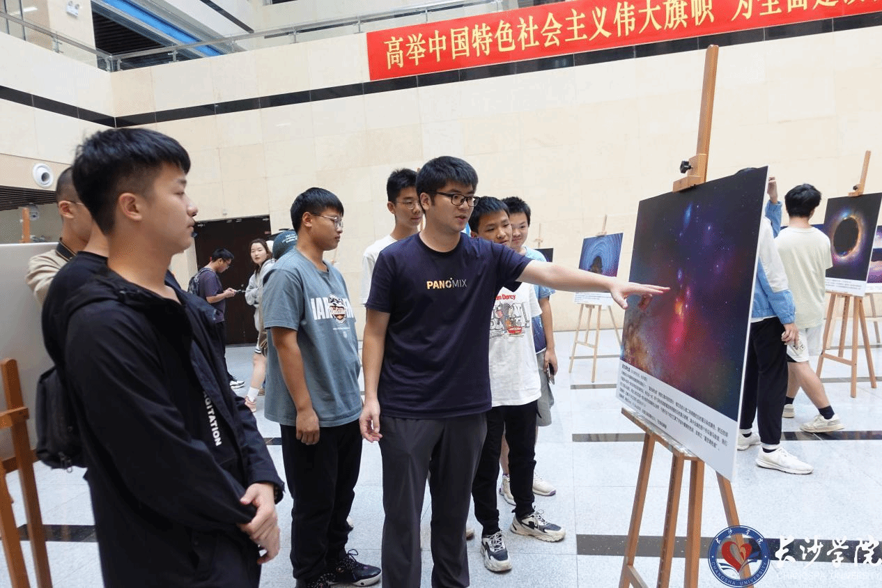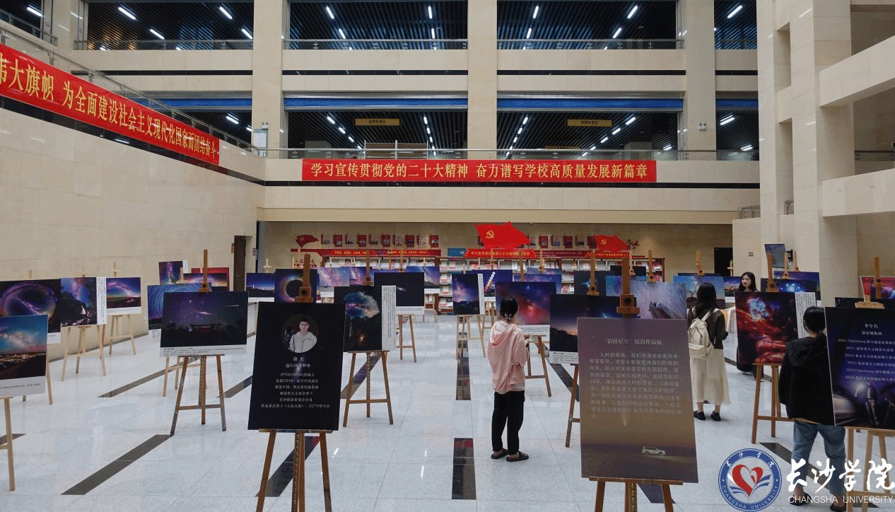 据了解,讲座前期,学校图书馆在一楼中庭举办了《浪漫星空》摄影作品展,共展出了星野和深空两类摄影作品,共计40幅,由摄影师谢杰、李令名等拍摄。星野作品大多为《中国国家天文》《央视网》《人民日报》评选的优秀摄影作品,展示了不同季节不同地点的星空,深空作品则近距离呈现了遥远太空中的各种星云。广袤天空中的浩瀚星际给大家强烈的视觉冲击,引得师生读者纷纷驻足欣赏。