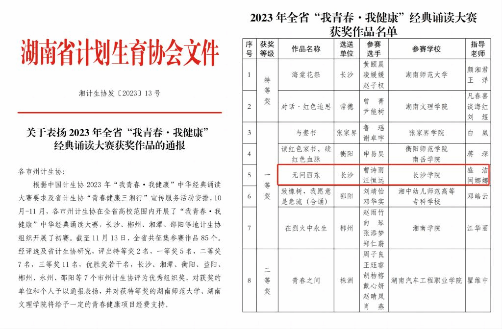 近日,由湖南省计生协举办的“我青春·我健康”经典诵读大赛落下帷幕,我校马栏山新媒体学院学生曹诗雨、汪恒远的参赛作品《无问东西》从全省近百个作品中脱颖而出,喜获一等奖,《致橡树》《迟到的勋章》两部作品获优胜奖。