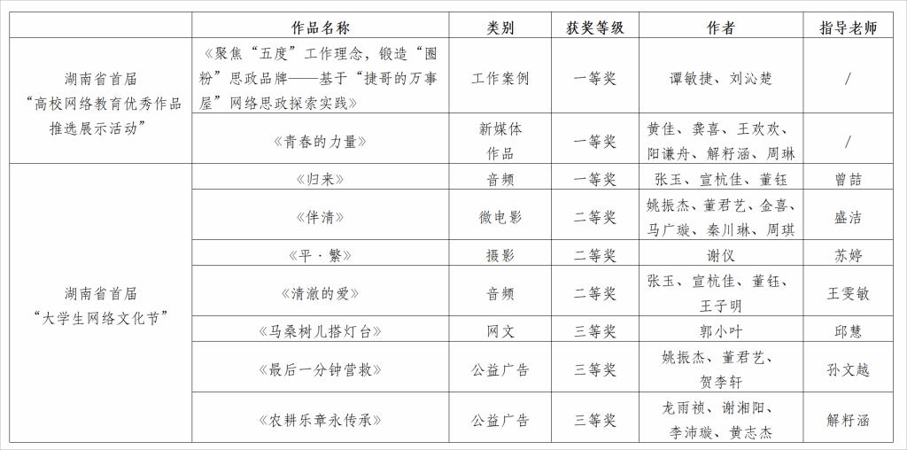 其中,凝结了我校辅导员网络思政工作思考与实践的《聚焦“五度”工作理念,锻造“圈粉”思政品牌——基于“捷哥的万事屋”网络思政探索实践》获首届“高校网络教育优秀作品推选展示活动”工作案例一等奖;以探索救国救民的青年毛泽东等老一辈共产党人为原型创作的短视频作品《青春的力量》获首届“高校网络教育优秀作品推选展示活动”新媒体作品一等奖;歌咏中国人民志愿军烈士的多人原创音频《归来》获湖南省首届“大学生网络文化节”音频类一等奖;《伴清》《农耕乐章永传承》等6项作品在微电影、摄影、公益广告、网文赛道也获得了好成绩……9项获奖作品充分彰显了我校深化“三全育人”综合改革、构建网络思政育人体系的新成效。