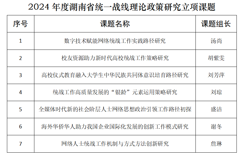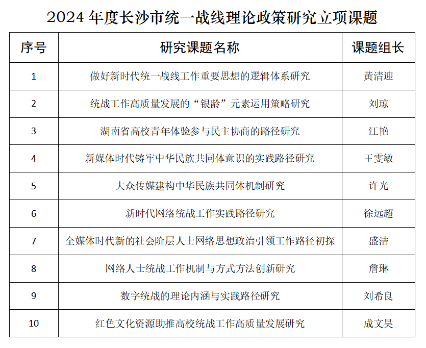 近日,湖南省委统战部、长沙市委统战部相继下发文件,公布了2024年度统一战线理论研究立项课题名单。我校7项课题获省级立项,10项课题获市级立项。