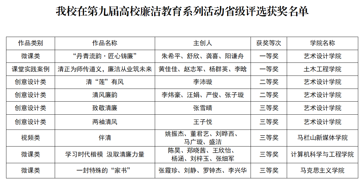 近日,湖南省教育厅公布了教育部第九届高校廉洁教育系列活动省级评选结果。我校9个优秀作品脱颖而出,荣获一等奖2项、二等奖2项、三等奖5项。其中,艺术设计学院的微课类作品《丹青流韵·匠心铸廉》和土木工程学院的课堂实践案例《清正为师传道义,廉洁从业筑未来》荣获一等奖并被推选至教育部参加评选。
