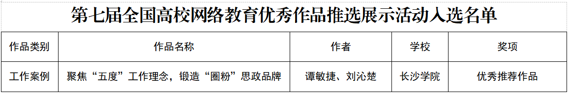 在全国大学生网络文化节中,我校选送的微视频《世界地球日沙画:守护蓝色家园》《毒》、音频《怀“绿我涓滴”,建“千顷澄碧”》获评优秀推广作品;微视频《地震自救黄金72小时》、其他创新作品《谨记此篇,送给不勇敢的自己》获评优秀展播作品;微视频《我的拿手好戏》获评优秀推荐作品;动漫《大学生“特种兵”安全旅游指南》、其他创新作品《他,在新疆开了一家米兰照相馆》获评优秀入围作品。在全国高校网络教育优秀作品推选展示活动中,我校辅导员谭敏捷、刘沁楚撰写的工作案例《聚焦“五度”工作理念,锻造“圈粉”思政品牌》获评优秀推荐作品。