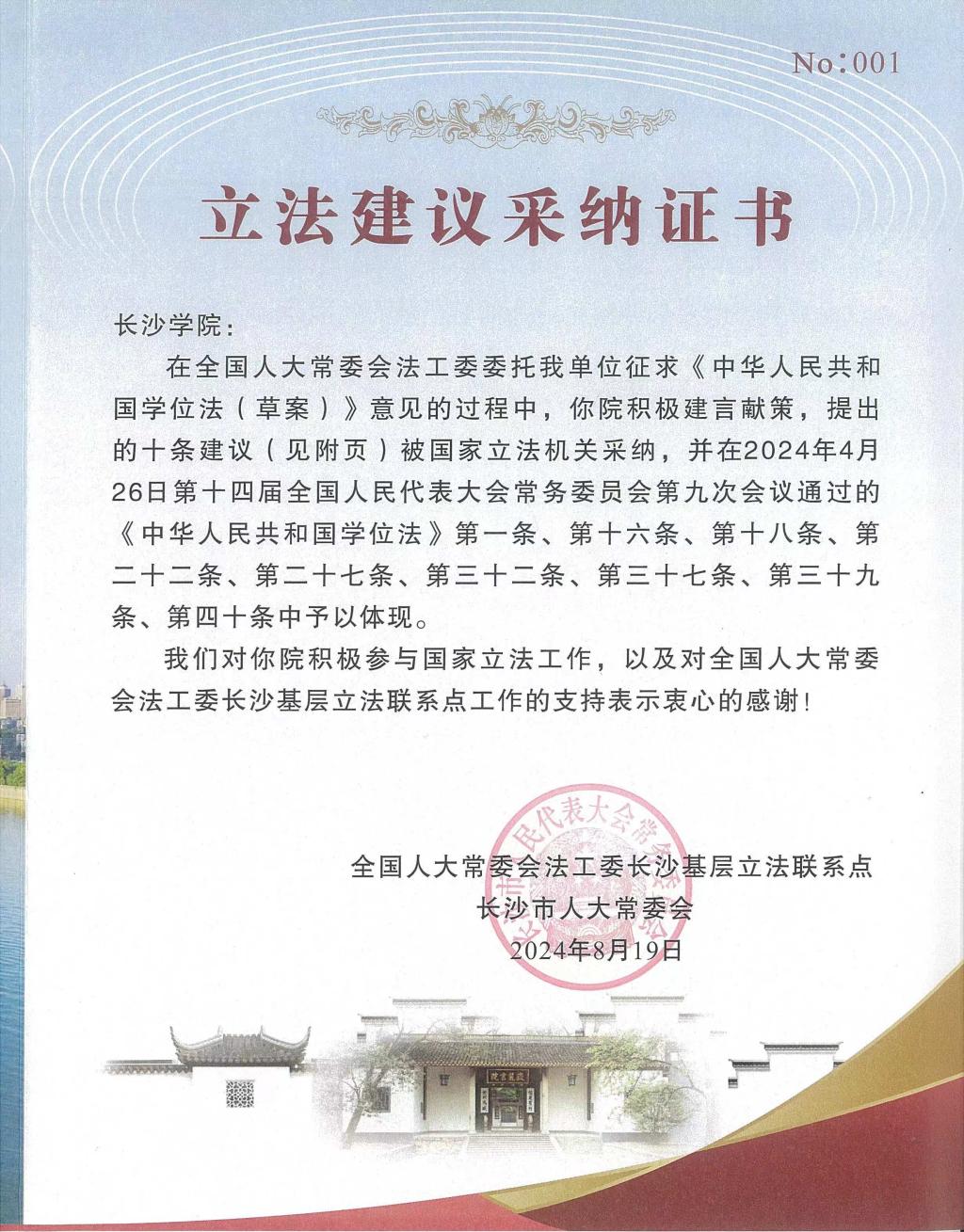 近日,全国人大常委会法工委长沙基层立法联系点(长沙市人大常委会)向我校授予“立法建议采纳证书”。此次长沙市人大常委会上报的立法建议被采纳数量创历史新高,充分展现了我校作为地方立法联系点的担当与作为。