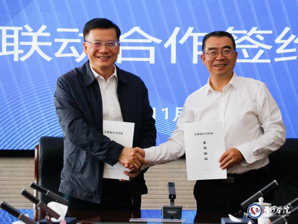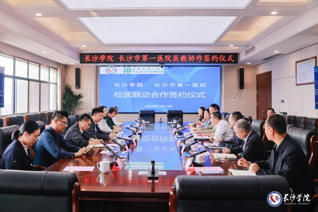 11月13日上午,长沙市第一医院与长沙学院医教协作签约仪式在长盛楼4001会议室举行。长沙市第一医院党委副书记、院长张树生,学校党委委员、副校长何利华出席仪式并代表双方签订校医合作协议。