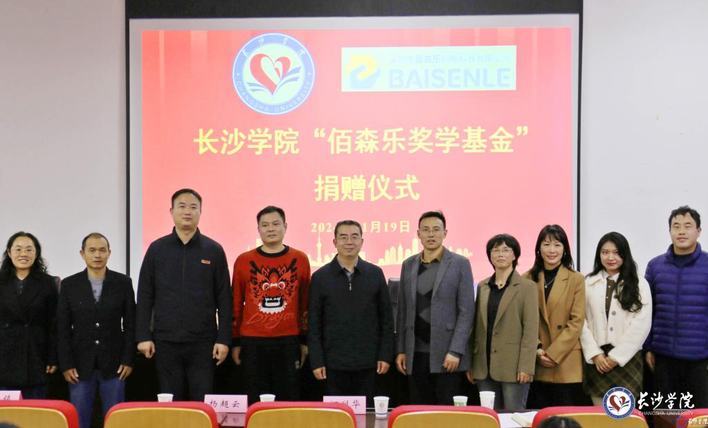 11月19日下午,长沙学院“佰森乐奖学基金”捐赠仪式在学校长智楼C501会议室举行。外国语学院2012届毕业生,深圳市佰森乐网络科技有限公司创始人、总经理杨超云校友再次向母校捐赠15万元并设立“佰森乐奖学基金”。学校党委委员、副校长何利华出席捐赠仪式并为杨超云颁发“优秀校友”荣誉证书。招生与就业指导处(校友会)处长黎文普、学生工作处处长张镇及外国语学院师生代表参加。捐赠仪式由黎文普主持。