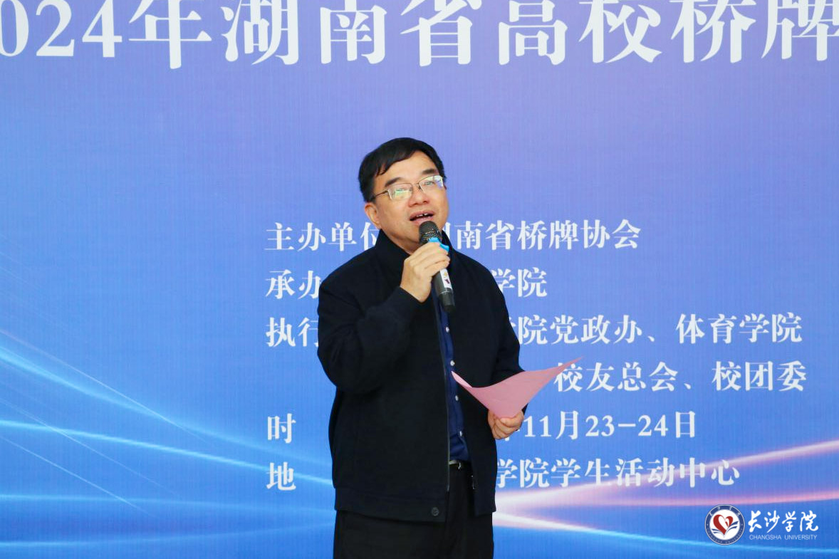 省人大常委会原副主任、省教育基金会理事长王柯敏,湖南省桥牌协会副主席陈鄂湘,学校党委委员、副校长何利华,原副校长王永宏等领导出席开幕式,湖南省桥牌协会副主席兼秘书长王跃武主持开幕式。
