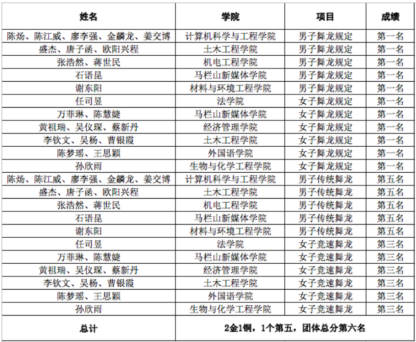 12月16日至23日,由湖南省教育厅主办的2024年湖南省大中学生武术和舞龙舞狮比赛在长沙轨道交通职业学院体育馆举行。来自全省76所大中学校,99支参赛队伍,1361名运动员齐聚一堂,共赴这场体育盛会。我校舞龙队24名运动员,在男子规定、女子规定、女子竞速项目中斩获2金1铜,并获得团体总分第六名;我校武术队8名运动员,在初级拳、初级棍、初级刀、初级枪、对练项目中斩获2金3银,并获得甲组团体总分第二名。