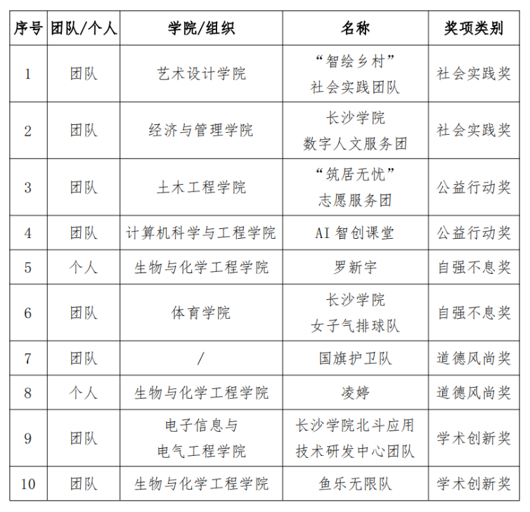 本次活动由共青团湖南省委、湖南省学生联合会、湖南省青少年发展基金会主办,共青团长沙学院委员会、长沙学院学生会承办,旨在树立和宣传具有时代特色和卓越精神的青年榜样,鼓舞广大青年学子汲取奋进力量,书写青春华章。历经学院推荐、资格审核、网络风采展示、班级代表投票、评委评议、校内公示等环节,长沙学院国旗护卫队等10个团队(个人)脱颖而出,获得第十九届“芙蓉学子·榜样力量”优秀大学生荣誉。