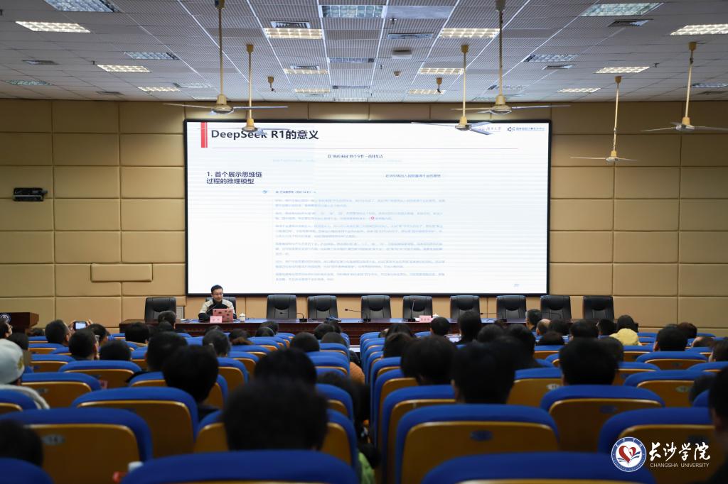 4月1日下午,国家超级计算长沙中心常务副主任、湖南大学陈果教授应邀在我校致远楼学术报告厅举办题为“我们该如何看待DeepSeek——what, how, why, and next?”的专题讲座。讲座由党委委员、副校长张世英主持。