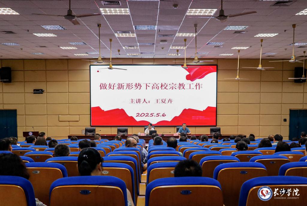 5月6日下午,我校在致远楼学术报告厅举办2025年宗教工作专题培训。党委委员、副校长何利华主持会议。全体中层干部、党支部书记、学生辅导员参加培训。