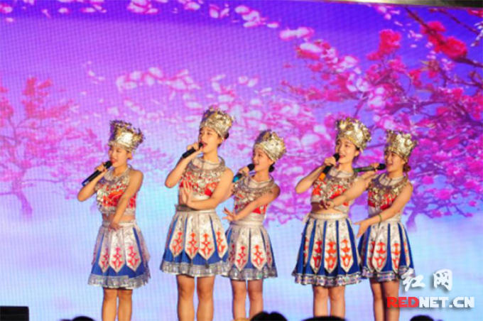 长沙学院音乐学院的文化志愿者为路口镇父老乡亲表演女生小组唱《蝴蝶泉边》。