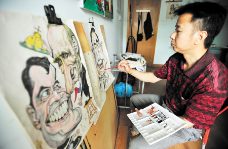 大鼻子的普京和梅德韦杰夫、戴眼镜的福田康夫……这些栩栩如生的人物漫画,都出自南昌聋哑人袁献军之手。袁献军从聋哑学校毕业后,先跟着民间艺人学习大理石雕刻艺术,后来自学肖像漫画。他表示想当一个职业画家,但是像他这样能把兴趣、特长变成工作的残疾人朋友非常少。
