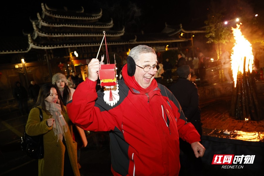 在溆浦枫香瑶寨的篝火晚会上,提着小龙灯的Denis,玩得十分尽兴。