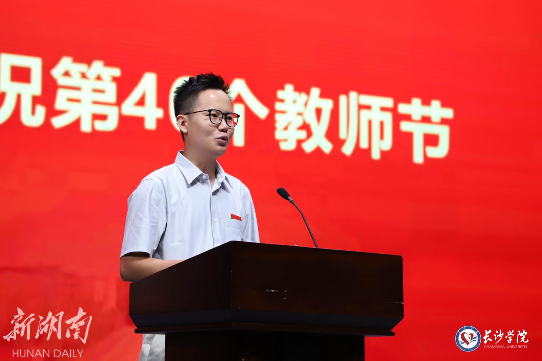 经济与管理学院2021级物流管理专业杜松霖代表全体学生向老师们送上了真挚的节日祝福,表示将为强国建设、民族复兴作出青年一代应有的贡献;全国高校青教赛三等奖获得者、马栏山新媒体学院教师周阿红,荣休教师代表赵小燕讲述了自己在教学科研、教书育人、管理服务中的深刻感悟;经济与管理学院陈智博士作为新进教师代表,表示将尽快适应新角色、新要求,坚守“四有好老师”的思想行动原则,为学校贡献更大的“新进”力量。随后,49名新进教师进行了庄严的入职宣誓。