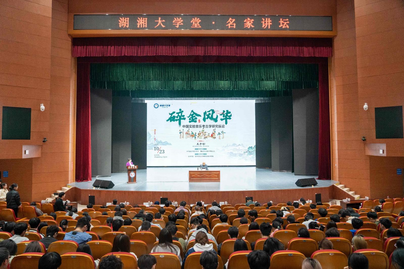 10月23日,由中共湖南省委宣传部、湖南省社科联联合主办,长沙学院、长沙学院音乐舞蹈美育传承基地承办的2025年第2期湖湘大学堂·名家讲坛在长沙学院开讲。本期活动特别邀请我国音乐考古学领域的权威学者、中国矿业大学特聘教授、中国音乐史学会名誉会长王子初教授担任主讲人,以《碎金风华——中国实验音乐考古学研究纵论》为主题进行授课。省社科联党组成员、副主席、秘书长(兼)贺建湘,长沙学院党委委员、副校长阳王东参加活动。省社科联干部代表、长沙市社科工作者代表、市民代表与长沙学院师生代表等近千人现场聆听。