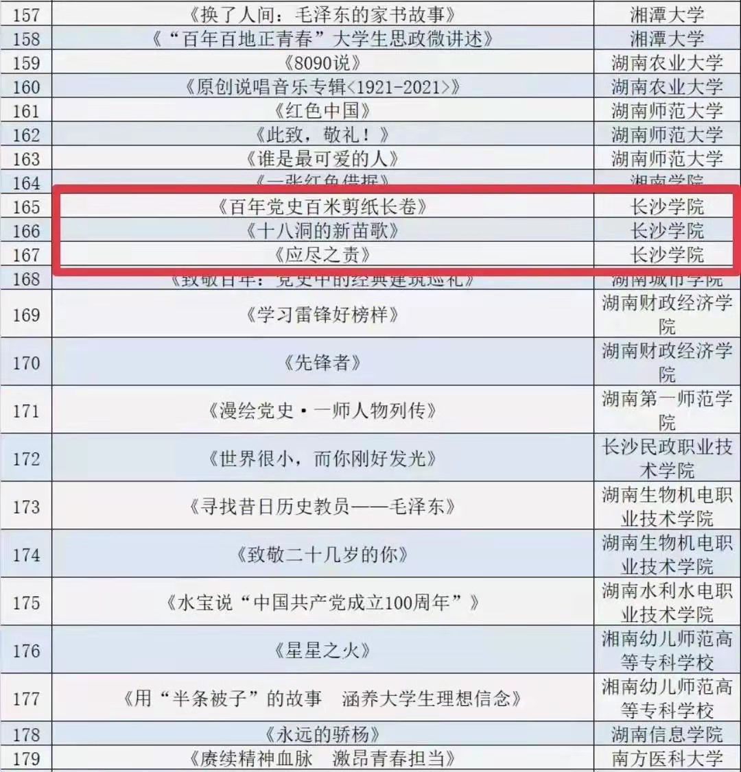 近日,全国高校思想政治工作网公布了全国高校庆祝中国共产党成立100周年的原创精品推广遴选结果,长沙学院党委宣传部组织选送的《百年党史百米剪纸长卷》《十八洞的新苗歌》《应尽之责》3个优秀作品纳入《百年珍贵记忆——全国高校庆祝中国共产党成立100周年原创精品档案》。据悉,此次评选全国高校共有225项优秀作品入选,长沙学院是众多高校中入选作品最多的高校之一。