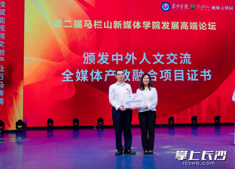 本次论坛由长沙学院和马栏山视频文创园管委会共同主办,以“新时代、新媒体、新业态、新趋势”为主题,分为主论坛和分论坛两个部分。现场,教育部中外人文交流中心副主任夏娟向长沙学院颁发中外人文交流全媒体产教融合项目证书。
