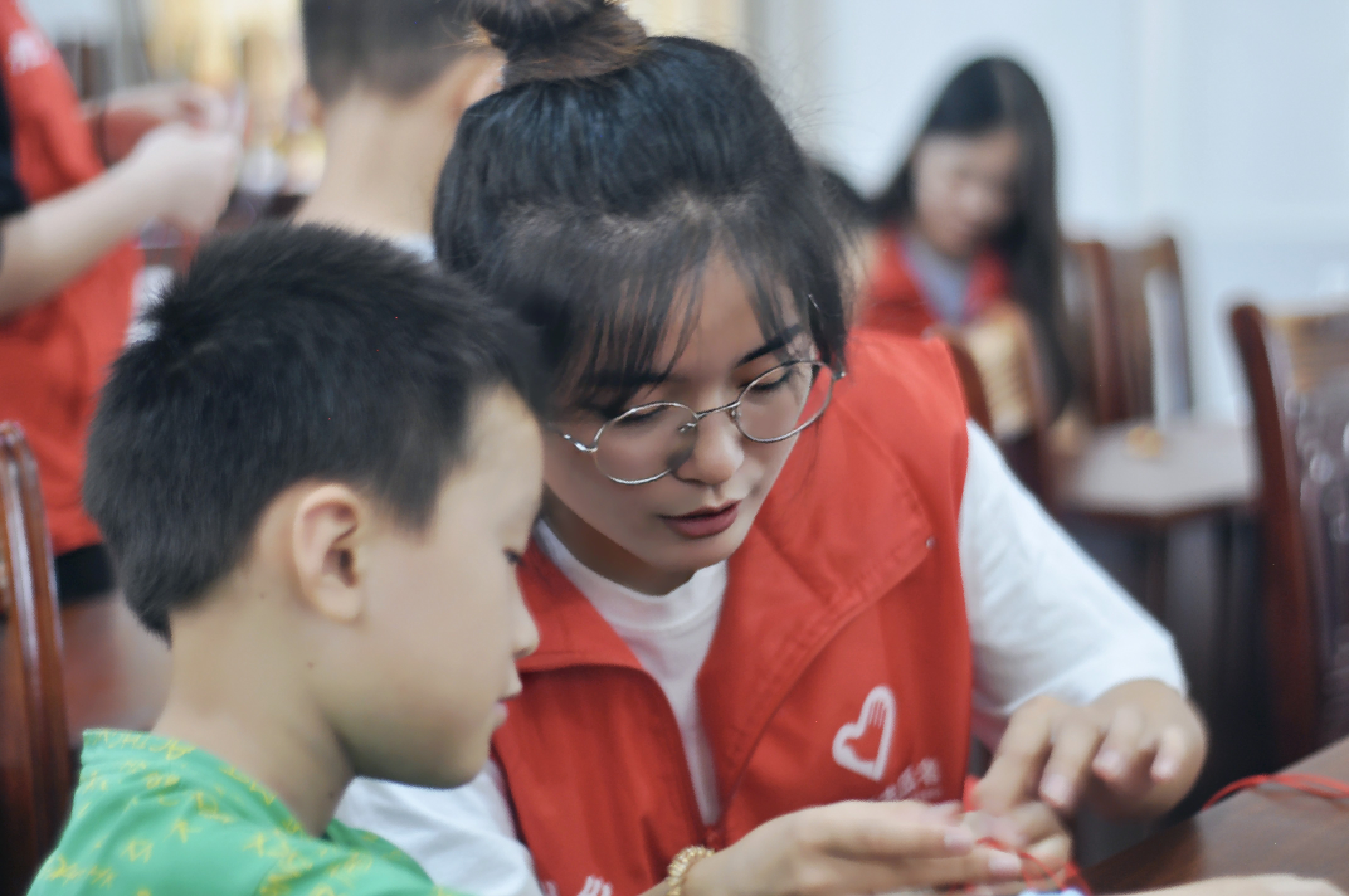 志愿者教孩子们制作传统手工艺品。 拍摄:胡永长