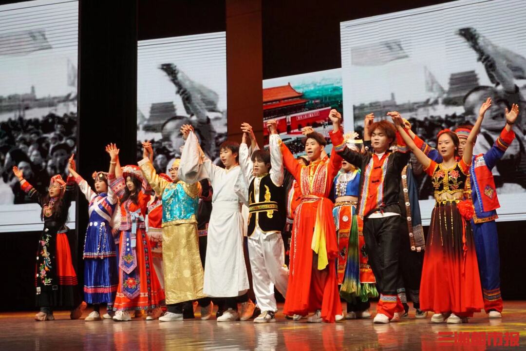 计算机科学与工程学院22数媒1班团支部在舞曲中挽起了五十六个民族的手,一幅“国家繁荣、民族团结、人民幸福”的美丽画卷在大礼堂的舞台上徐徐铺开。