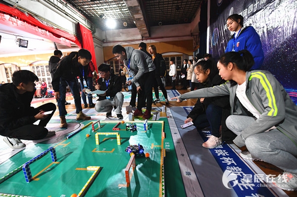 星辰在线12月6日讯(通讯员 朱珊)在放大版的校园地图上,两辆智能小车沿着固定的跑道并驾齐驱,顺利驶过一个个接近90°的弯道,不时赢来观众席阵阵欢呼。12月4日晚上,在长沙学院举办的新生智能小车体验赛决赛暨智能飞车竞速赛决赛上,这幕类似于“头文字D”的画面在该校学生活动中心上演。46支由2018级新生组成的小车队伍和20支由高年级学生组成的飞车队伍在舞台上轮番竞技,赛事实况通过摄像机投影到场内大屏幕上,观众们看得不亦乐乎。