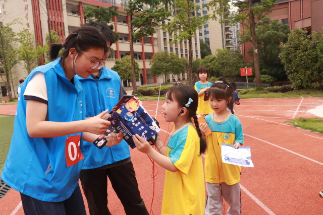讲座结束后,在基地志愿者们的带领下,小朋友们开展了一场户外探索比拼。大家简单学习了无线电信号传播知识后,在校园里的各个角落认真搜寻着任务点。在每个点都设置了与北斗导航系统知识相关的任务,通过比赛宣传普及科学知识,激发小学生们对北斗科技的好奇心。小朋友们成功找到所有任务点后,带着满满的成就感结束了此次科普活动。