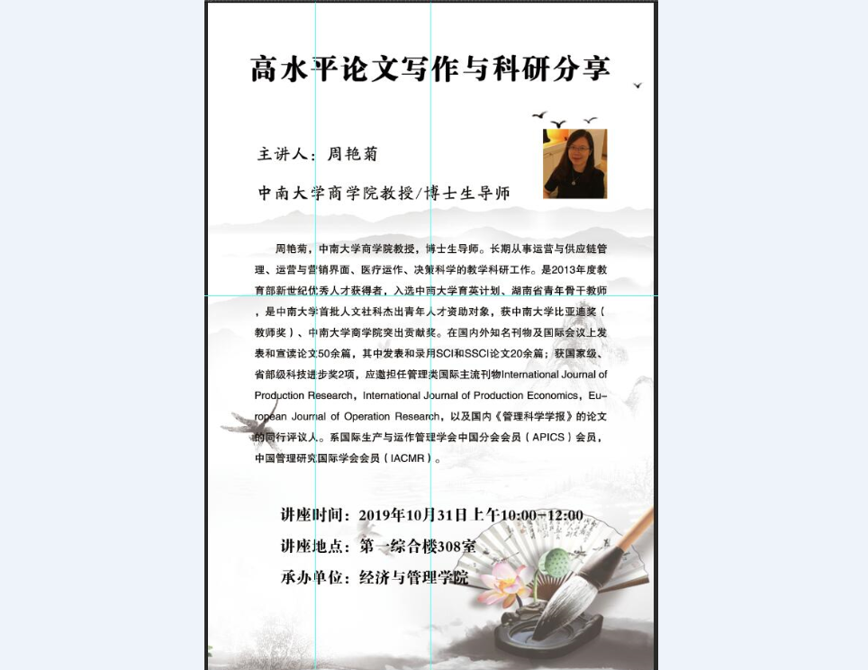 2019讲座主题:高水平论文写作与科研分享讲座时间:2019年10月31日上午10:00-12:00讲座地点:第一综合楼308室承办单位:经济与管理学院讲座内容: 1.高水平论文写作方法与技巧 2.科研项目申请及经验分享主讲人:周艳菊,中南大学商学院教授/博士生导师